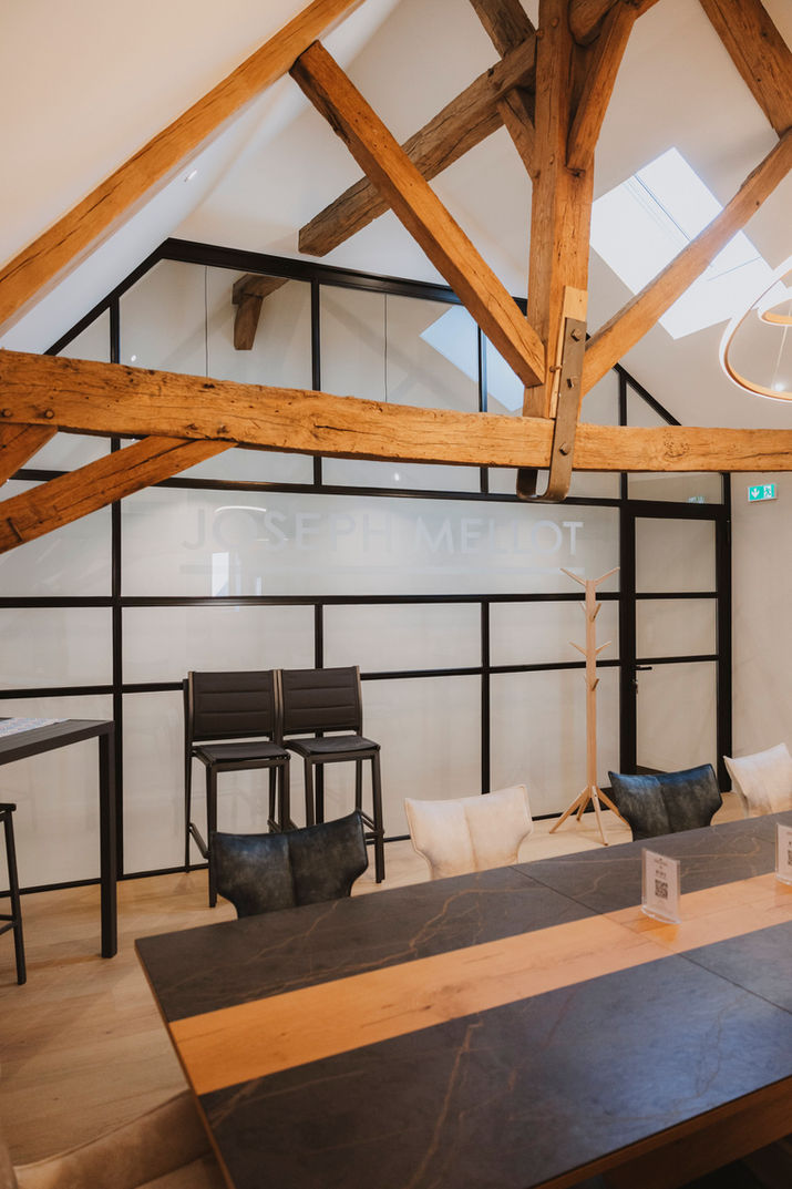À l’étage, une verrière intérieure assure la transition visuelle et acoustique avec la salle de dégustation, tandis que la charpente apparente valorise le volume et la luminosité. Un office complète le dispositif fonctionnel.